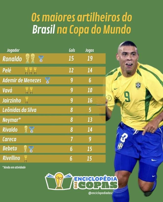 最近TNT体育整理了巴西队世界杯历史射手榜,罗纳尔多15球排在第一,贝利12球排在第二,内马尔8球也已经排在了前列。巴西队世界杯历史上的顶级射手,几乎都在这张榜单里。可名单摆出来之后,很多人第一反应可能不是罗纳尔多第一,而是内马尔只排在这个位置?